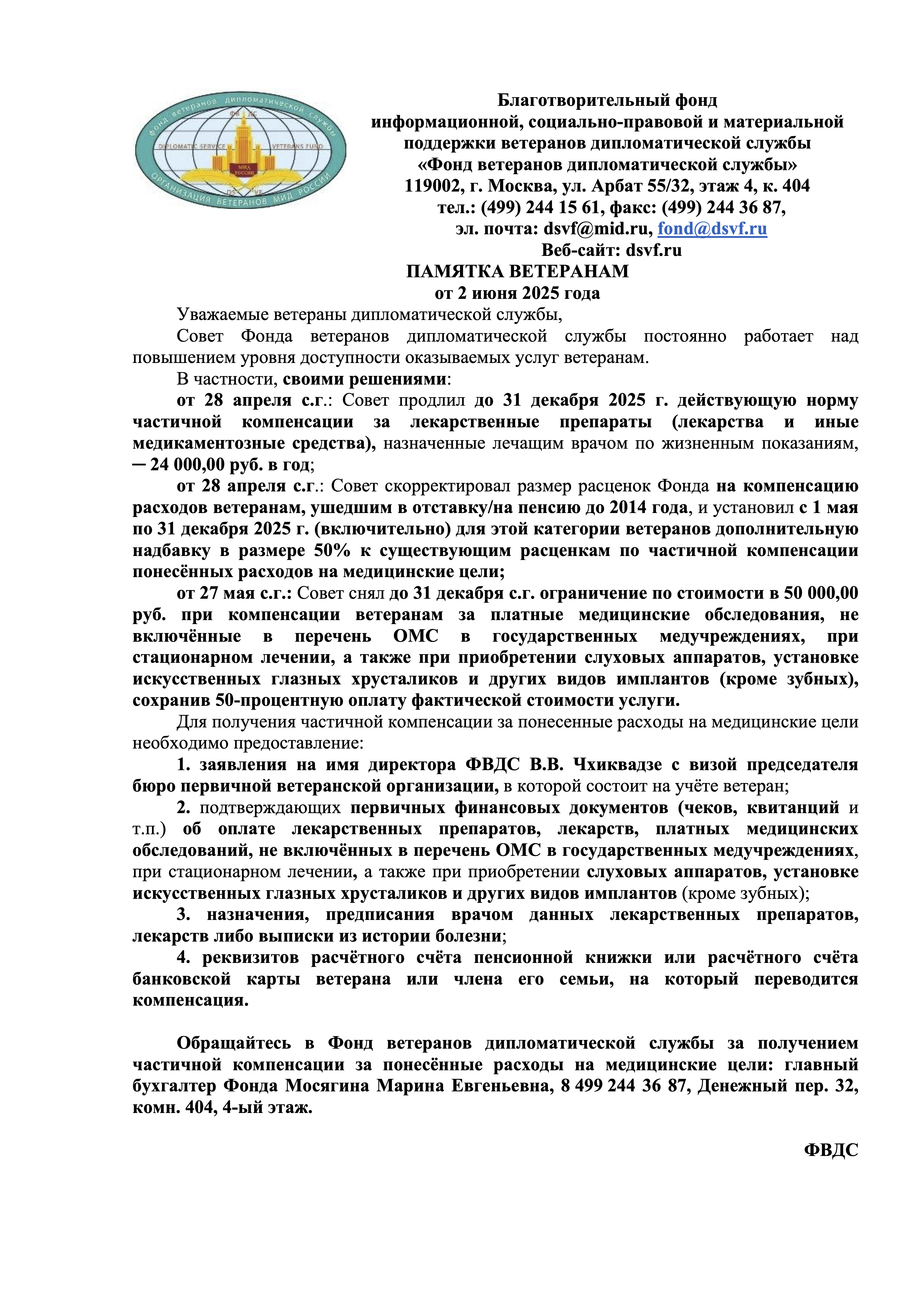 Обращайтесь в Фонд ветеранов дипломатической службы за получением частичной компенсации за понесённые расходы на медицинские цели: главный бухгалтер Фонда Мосягина Марина Евгеньевна, 8 499 244 36 87, Денежный пер. 32, комн. 404, 4-ый этаж.