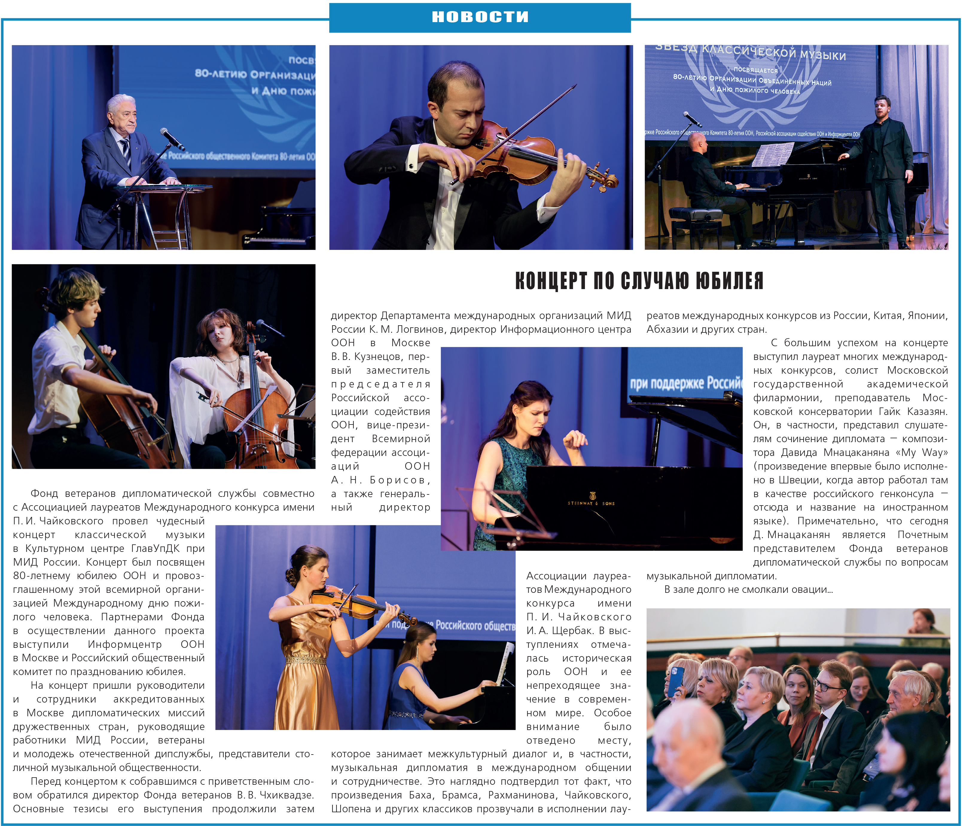 Фонд ветеранов дипломатической службы совместно с Ассоциацией лауреатов международного конкурса имени П.И. Чайковского, при поддержке Информцентра Организации Объединённых Наций в Москве и Российского общественного комитета по празднованию 80-летия ООН (Комитет ООН-80) 29 октября с.г. провёл в зале Культурного центра ГЛАВУпДК при МИД России благотворительный концерт с участием звёзд классической музыки, посвященный 80-летию созданной 24 октября 1945 года Организации Объединённых Наций и Международному Дню пожилого человека.